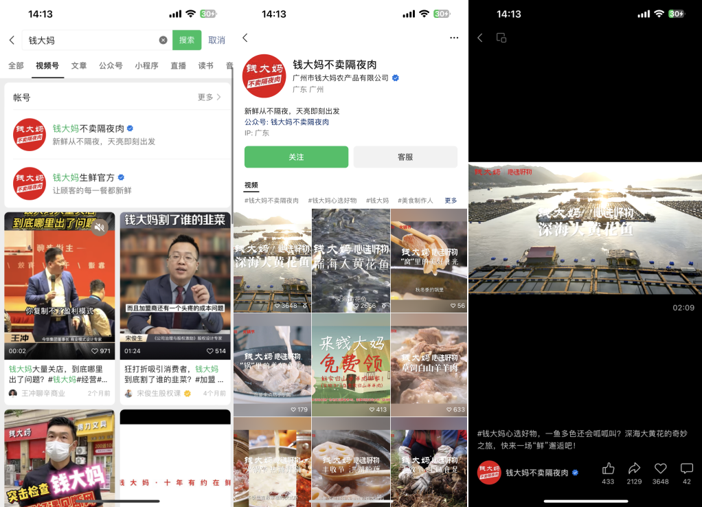 钱大妈在视频号有2个账号,「钱大妈不卖隔夜肉」和「钱大妈生鲜官方」,视频号账号主要内容是产品介绍、福利活动、会员推广以及美食分享等。
