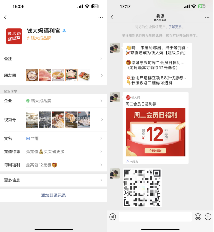 自动欢迎语:添加企微后,企微自动发送欢迎语。欢迎语中附带社群二维码,长按识别二维码即可加入社群,并且会自动发送「周二会员日福利券」的小程序链接,引导用户成为付费会员。