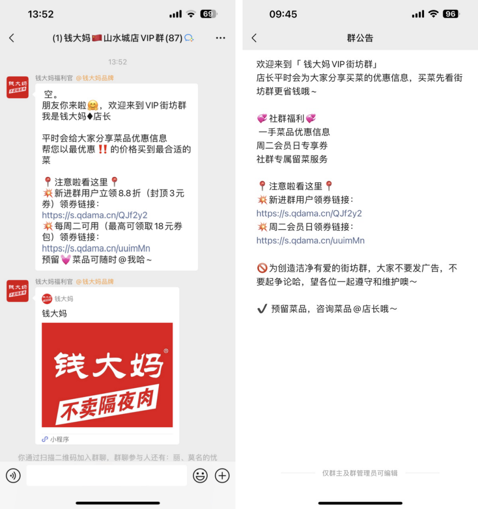 用户入群后会第一时间触发自动欢迎语,主要引导领取新进群88折优惠券和每周二福利券,群引导预留菜品可以随时@店长(群主)。群公告和欢迎语是一样的内容。