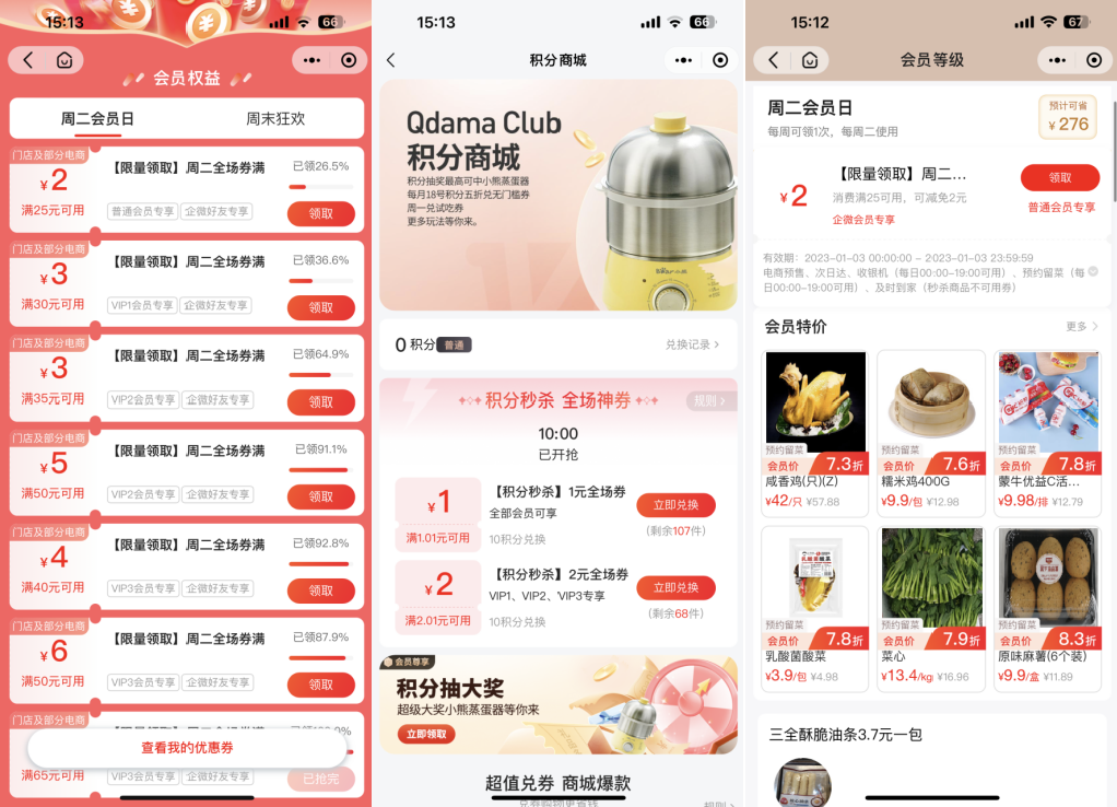 会员等级越高享受的权益越,包括会员特价、积分抵现、生日礼券、预约留菜、运费优惠等。