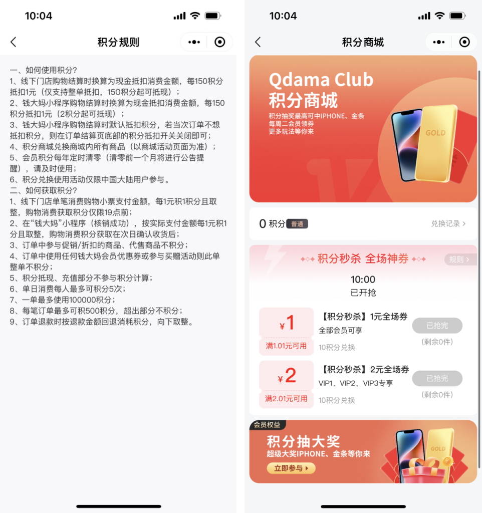 用户通过消费可以获得积分(消费1元积1分),积分能用来兑换优惠券、积分抽奖等。