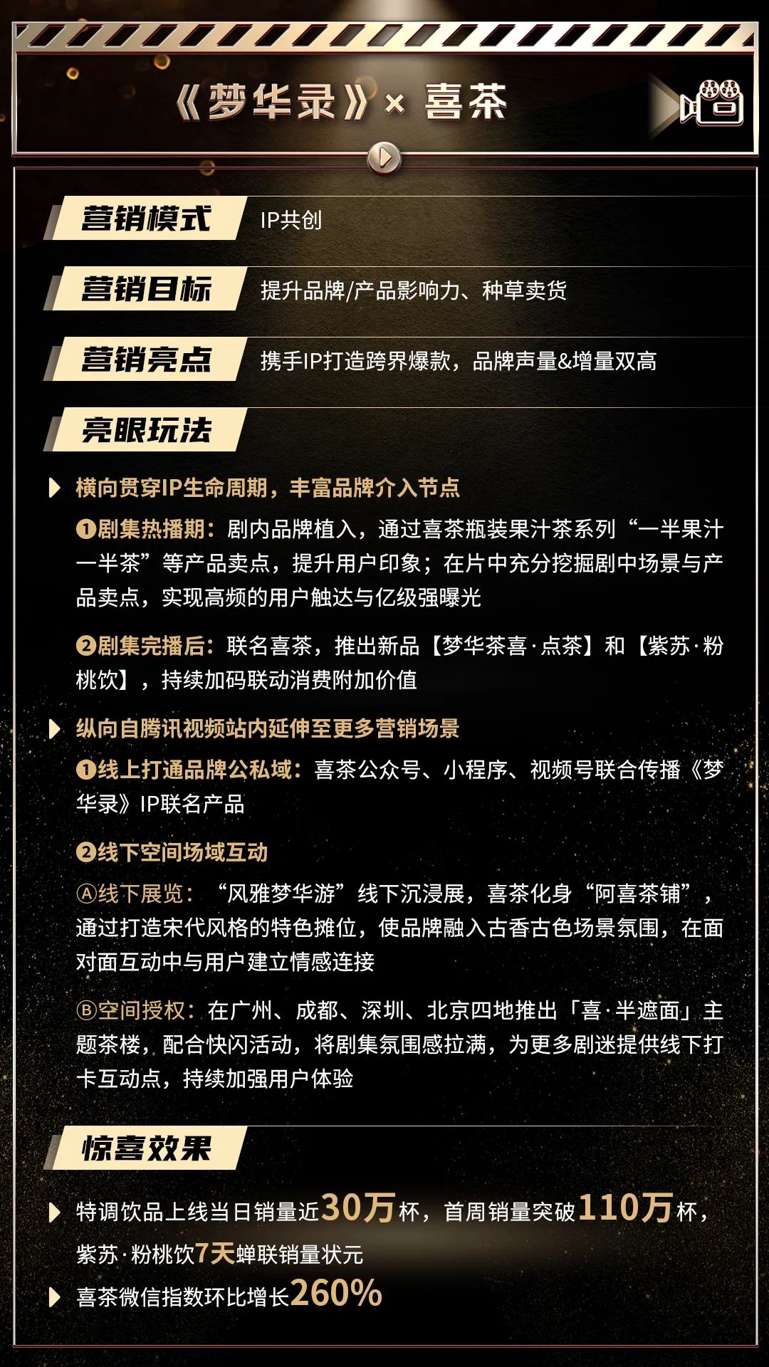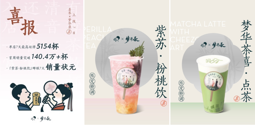 搭载暑期爆款IP《梦华录》,喜茶横向贯穿剧集播出全周期,纵向以多种营销场景拓展人群,通过与剧集深度共创,成功将IP力转化为品牌力。