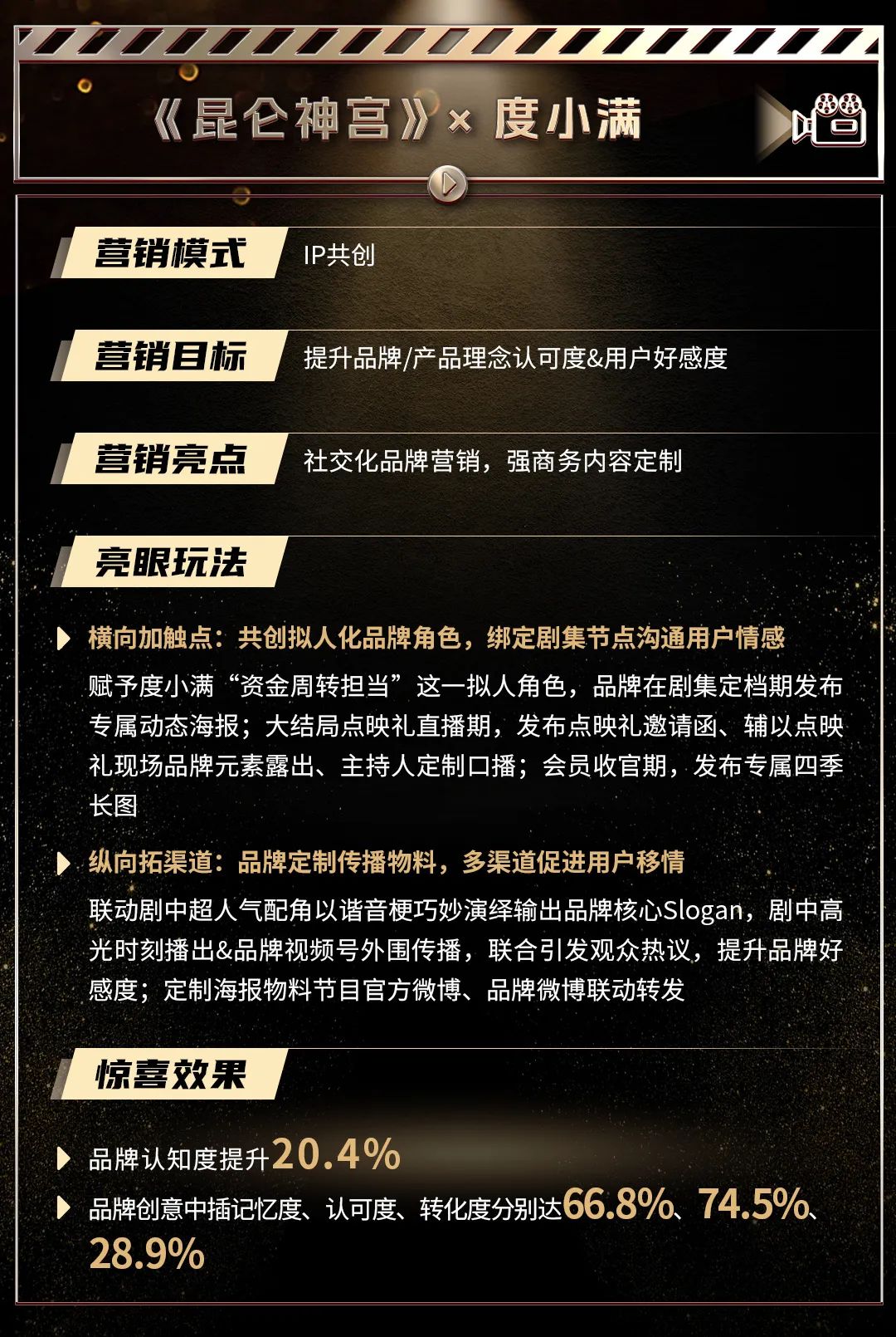 《昆仑神宫》与度小满的合作案例中,双方共创的拟人角色绑定剧集重要节点,并在各个渠道发布定制创意中插视频,集中且高声量释放品牌价值。