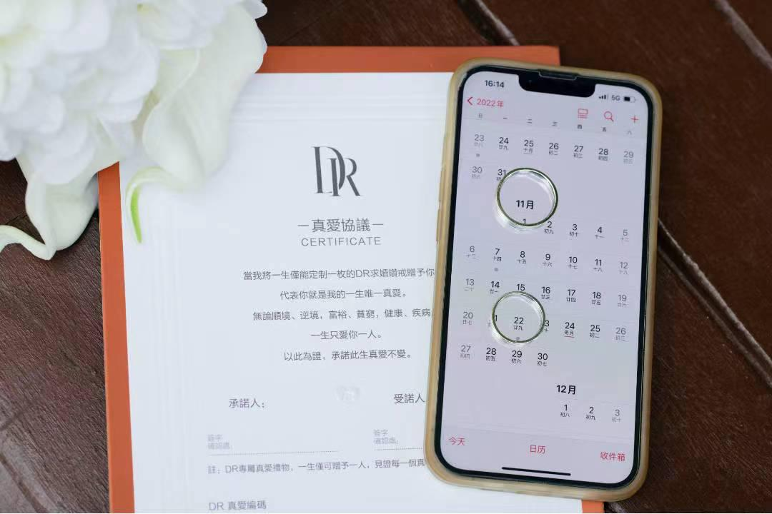 DR 定位求婚钻戒,规定“男士一生只能定制一枚”。这个规定看似在约束男性,其实是牢牢把握了女性在爱情中渴望被视作唯一的心理。DR 在全球拥有近 450 家真爱体验店,每一位消费者购买产品后都要绑定身份 ID 、签署真爱协议,品牌还为两位准新人打造虚拟专属空间,可以说是拉满仪式感。DR 还出现在吴京 & 谢楠、戚薇 & 李承铉等明星的求婚仪式,赚足了眼球。