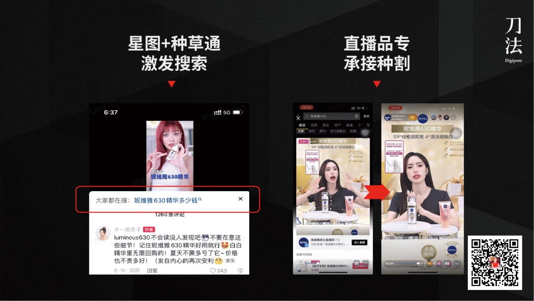 以妮维雅为例,他们发现,用户对常规的挂车种草内容会有一定的抵触情绪,而行业数据显示,种草短视频 5 秒播放率越高,CPA3 越低。所以在种草投放阶段,妮维雅选择投放不挂车短视频,结合用户反馈优化 5 秒播放率,同时运用“种草通”去寻找对品牌、品类兴趣到更高的 A3 人群,激发用户点击评论区“小蓝词”等看后搜行为,有效激发搜索,推动了“妮维雅630精华”抖音日均搜索量环比增加 500%。
