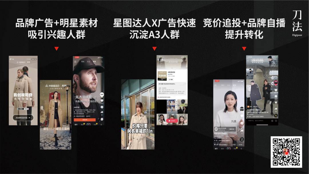 它的做法主要是三步:第一步是比较常规的开屏广告+明星素材信息流,先把泛兴趣人群吸引过来;第二步,优化达人投放环节,针对穿搭场景、产品卖点等优质内容进行加热追投,到这里,已经完成了人群的二次筛选,精准沉淀有购买需求或内容偏好的 A3 人群;第三步,再次结合明星广告素材投流,邀请明星空降品牌直播间,搭配日常种草和大促集中爆发,实现直播电商 GPM 增长 3000w+。