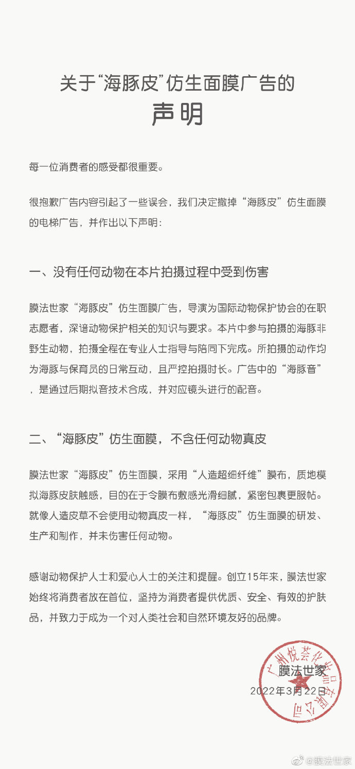 意识到事态发展苗头不对,膜法世家紧急撤下这则广告,并发布了致歉声明,条理清晰地回应了网友的质疑,挽回了一些声誉。