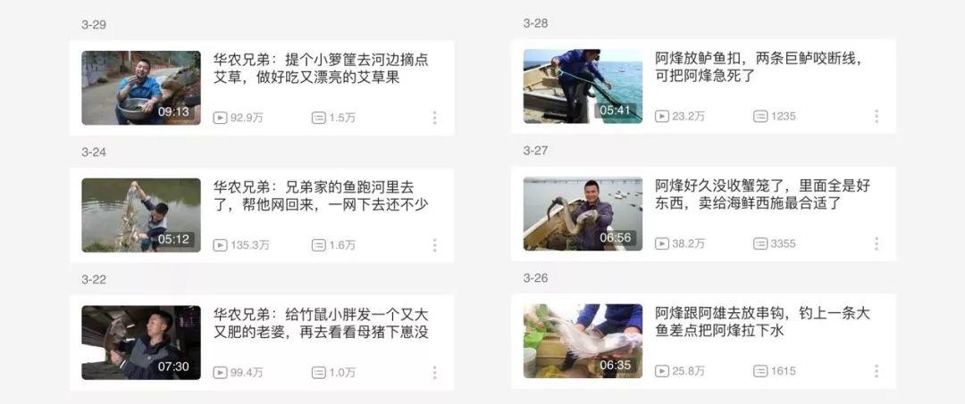 当下用户每日生活在时间和空间上都高度的碎片化,除非身处一个比较稳定的环境下(比如被窝里),否则用户很难去点开一个时长超过20分钟的视频并耐心看完。短视频的优势由此体现,华农兄弟和赶海人们所拍摄的视频每集时长不会超过10分钟,不会耗费用户太多时间,能让用户有信心点开并看完,适用于消遣碎片时间。每集10-20Mb的大小,也让用户在通勤,排队等非Wi-Fi环境下观看起来没什么流量压力,符合当下用户内容消费习惯,也方便用户进行转发传播。