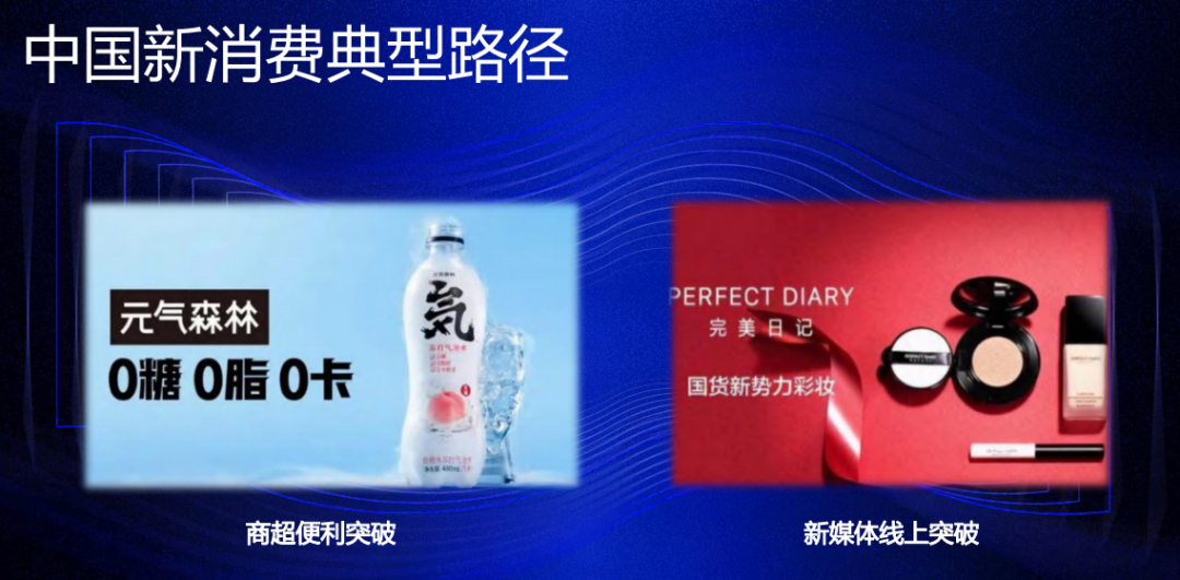 一类是以元气森林为代表的商超便利店突破,另一类就是以完美日记为代表新媒体线上突破。