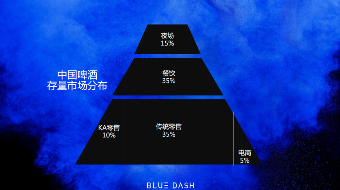 这是中国啤酒存量市场的分布数据,可以看到中国酒饮品类的电商化率只有5%,而美妆可能已经超过了50%,这意味着电商并不是酒饮最核心的渠道。