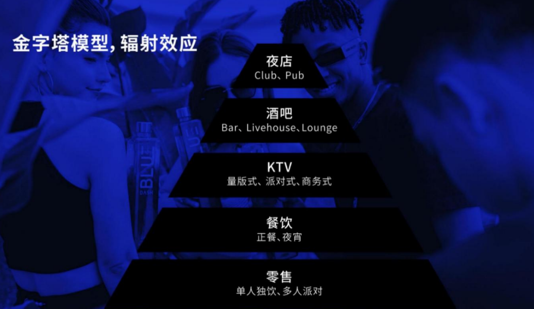 我们按照这个金字塔结构从高往低去打,第一战打在夜店而不是线上、便利店和餐饮,抓社交网络里面最有价值、最核心的1%核心饮酒人群。