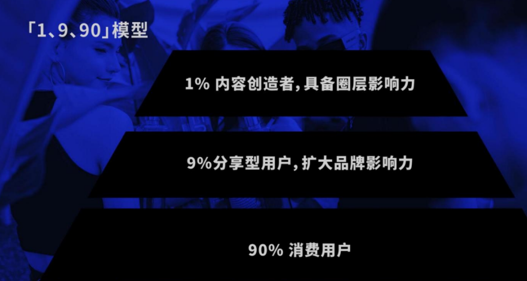 这是个比较典型的品牌传播模型,基本上适用于所有大品牌传播,1%是具有一定圈层影响力的内容创作者,9%是中腰部的KOL,属于KOC分享型用户,90%是普通用户。