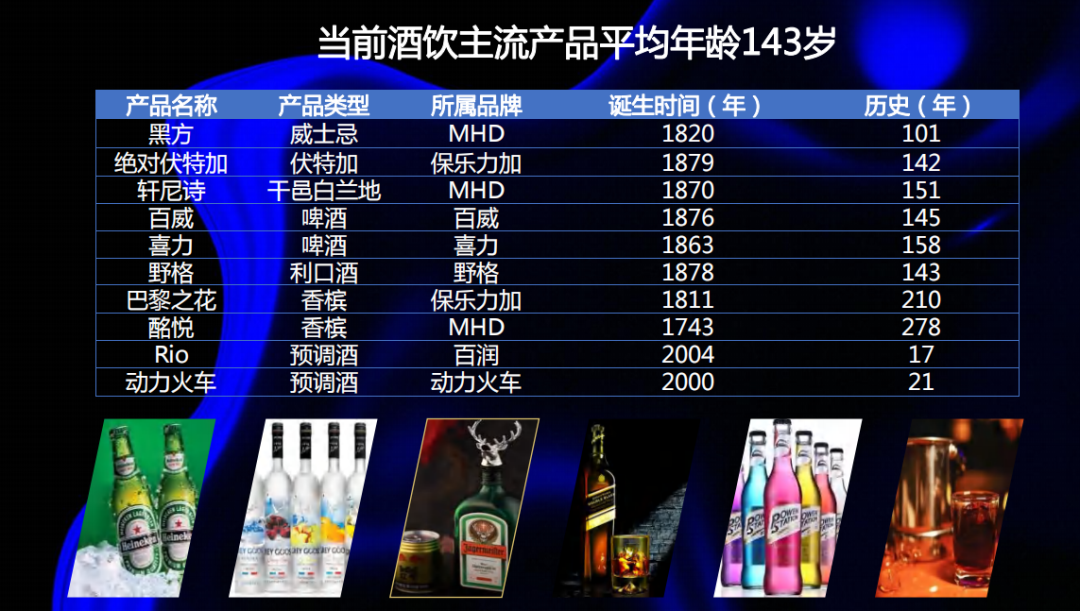回到酒饮品类上,现在洋酒和啤酒的主流品牌其实都是一些老品牌。