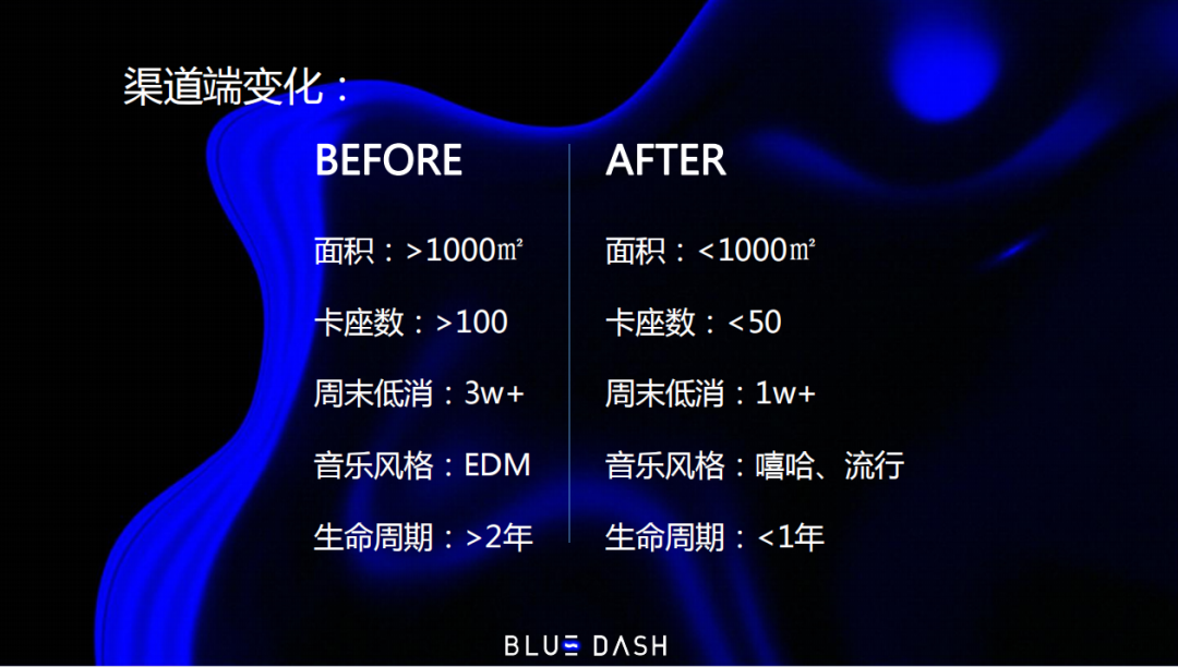 我们统计过21年卖BLUE DASH最好的30家夜店,到了22年一年后还在开业的只有10%,大家就可以想象这个行业这两年有多么惨烈,很多门店也在过去一年一下子就消亡了。