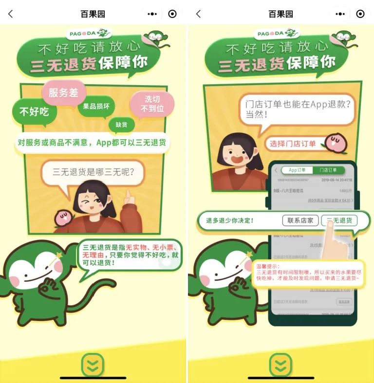 第三,百果园还为用户提供了“三无退货”服务,也就是“无实物、无小票、无理由”的退货。只要消费者有任何不满意,7天内都可以申请退货。
