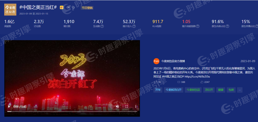 放开第一年,大众的情绪亟需一场烟花般的释放。近日,今麦郎在青岛奥帆中心用千架无人机化身璀璨星河,为国人奉上了一场的精妙绝伦的开年大秀。中国龙、书简卷轴、牡丹、中国结、红灯笼……今麦郎用现代黑科技致敬中国之美,同时也让“凉白开”这款饮料红透了天,同期话题战役#中国之美正当红#阅读量过亿。