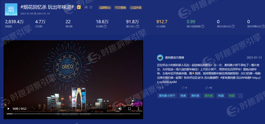同样做开年烟花大秀的,还有奥利奥。近日奥利奥发起#烟花回忆杀 玩出年味道#话题战役,在苏州金鸡湖畔用无人机模拟烟花,网友纷纷评价环保又震撼。
