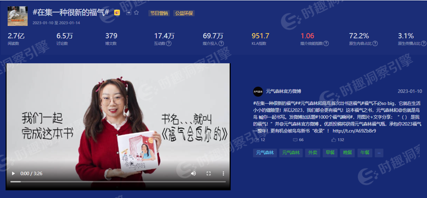 今年,不少品牌把祝福玩出了新意。元气森林和脱口秀演员鸟鸟发起#在集一种很新的福气#话题战役。在短片里,鸟鸟分享了自己小时候过年的趣事,提醒大家珍惜生活细节里的小幸福。鸟鸟还邀请网友写出自己的福气,一起编写她的福气之书《福气会鸟你的》,并送出元气森林福气瓶。这种新鲜有趣的参与形式吸引了众多网友,该战役原生内容占比超过70%。