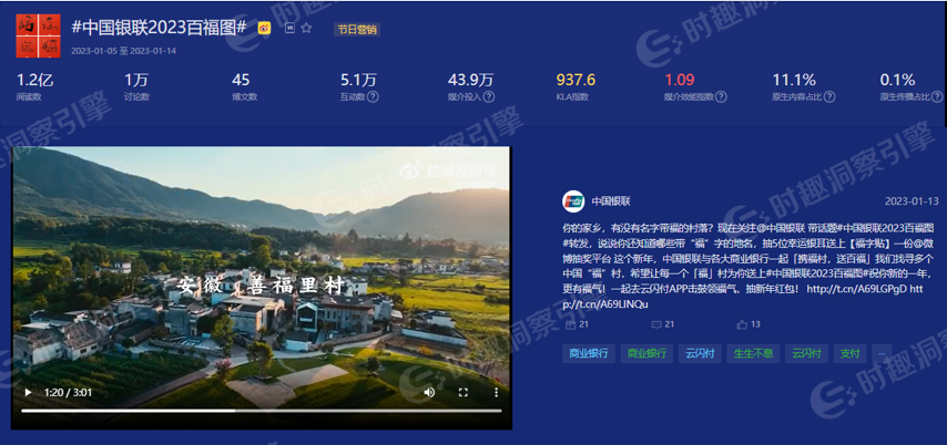 中国银联则把对家人的100种祝福话,变成一张张福字贴,如提醒爸爸少喝酒的“饮酒福”,提醒孩子要勇敢举手提问的“学业福”等,并发布#中国银联2023百福图#话题战役。同时,中国银联还发起“携福村,送百福”活动,向网友征集带“福”字的地名送上福字贴。在征集视频里,祖国各地的福村年味儿浓浓。