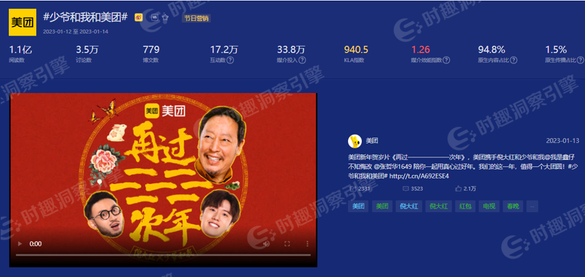 今年春节,“苏大强”重现江湖。美团携手倪大红&少爷和我,发布贺岁片《再过一一一一一一一次年》。片中父亲为了延长跟孩子们的团聚时间,假装失忆,孩子们为了配合父亲,过了一次又一次年。老人摩挲着孩子们的照片,“这几年来,家里的沙发就没坐满过”,让无数奔波在外的年轻人破防。同期话题战役#少爷和我和美团#KLA战役指数940.5,超过业内96%的战役。