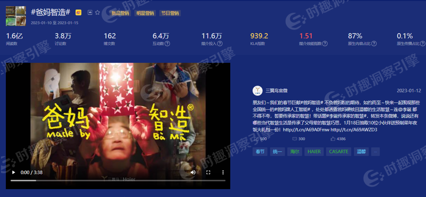 长大后一直在教爸妈,却忘了小时候他们曾是当之无愧的主角。近日,海尔旗下的智慧家庭场景品牌三翼鸟,推出了满满回忆杀的《爸妈智造》短片,“姥姥牌”控温饮水机,“妈妈牌”睡眠安心枕,“姥爷牌”蒸鱼计时器……如今,品牌用智慧家居传承并升级智慧生活方式,同期话题战役阅读量1.6亿。