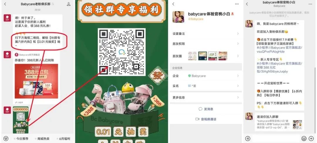 公众号Babycare老粉俱乐部——新关注自动回复引导扫码并弹出企微海报——扫描企微海报添加体验官桃小白——接受入群邀请。