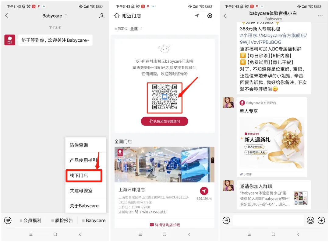 右侧菜单栏Babycare——子菜单栏线下门店——扫描二维码——添加体验官企微——体验官自动回复发送入群邀请——接受入群邀请进入私域社群。