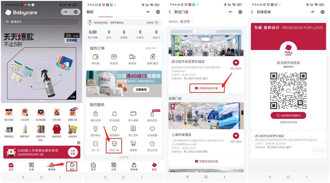 Babycare官方小程序首页点击右下方我的——附近门店——点击对应门店“详情咨询店长哦”——即可跳转对应店长企微——邀请进群。