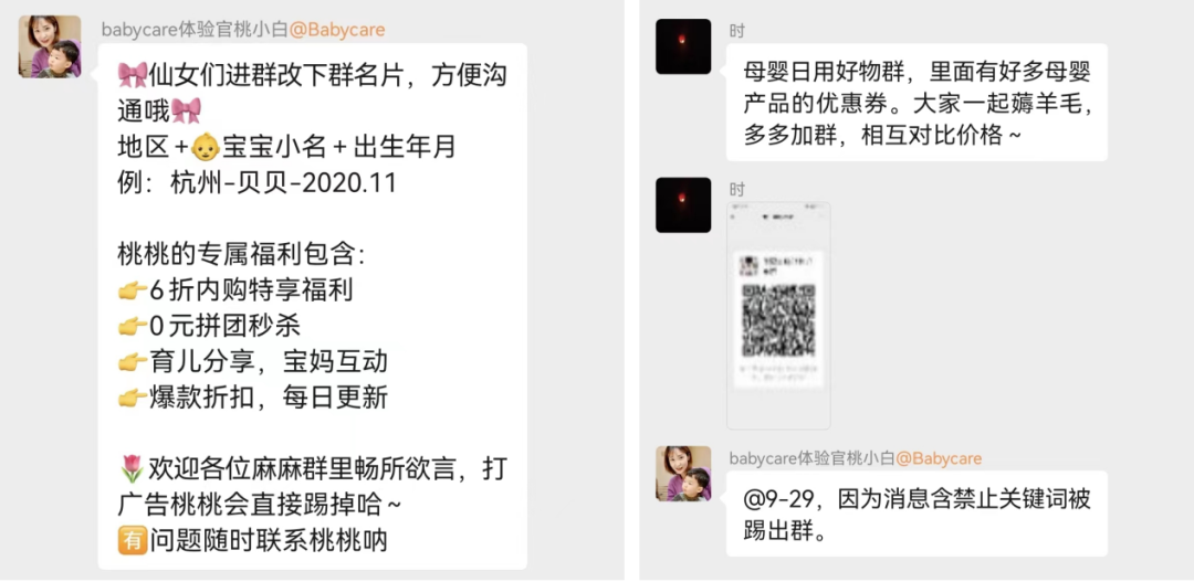 入群欢迎语+群规则:用户入群后会第一时间触发自动欢迎语,主要介绍加入社群的专属福利,以及社群的群规则,打广告者会被踢出群。