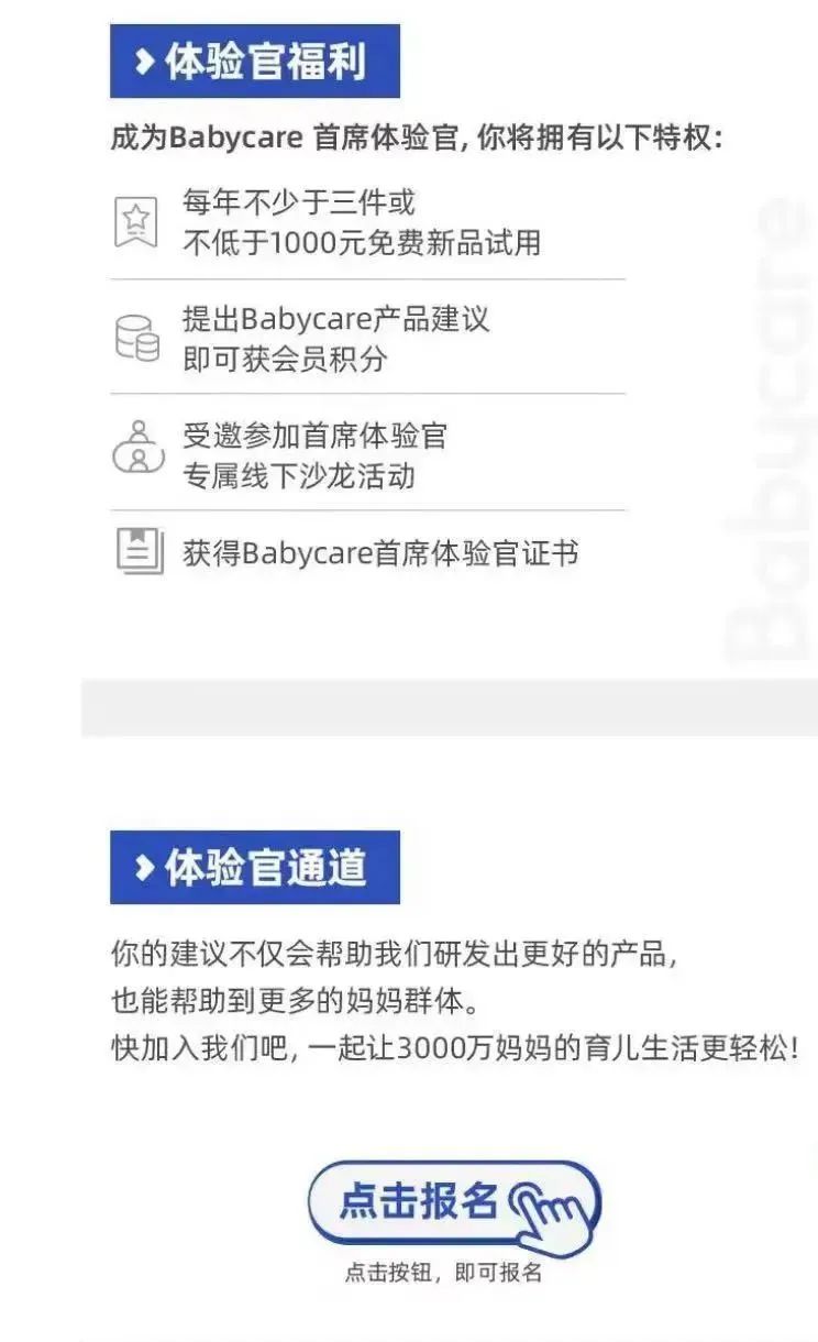 而回报上,babycare让体验官获得不少福利:体验官每年可以获得不少于三件或者不低于1000元的免费新品试用资格、收获品牌积分、参加线下沙龙。除了极具诱惑力的福利,Babycare还会给用户颁发体验官专属证书,荣誉加持下,用户也更愿意参与品牌共创。