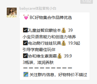 新人只要一入群就能获得专属优惠,每日更新的“好物特价”栏目单价维持在10-200之间,而且对比其他渠道价格,至少优惠20%,品类以玩具、湿巾等日用品为主,高频刚需的特性加上社群优惠价能诱导用户多次下单,有关数据显示,Babycare的复购率高达38%。