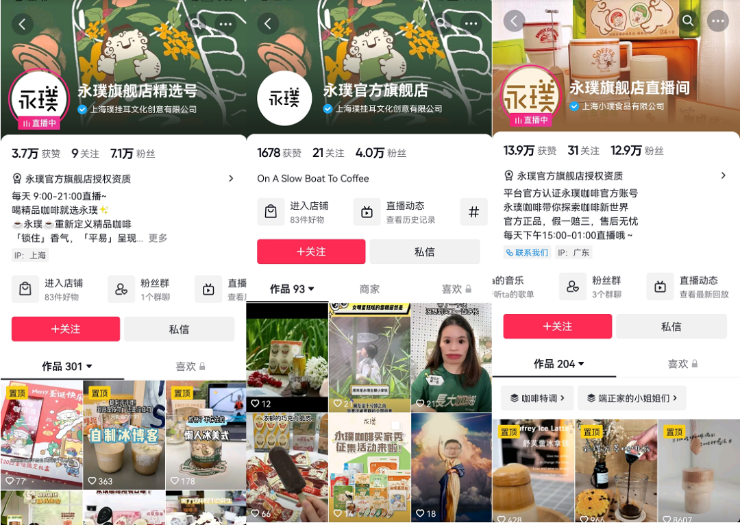 永璞在抖音主要有3个账号,视频内容以咖啡喝法攻略为主。另外除了官方旗舰店,其他2个账号都会安排直播和建立粉丝群,更好地与用户触达。