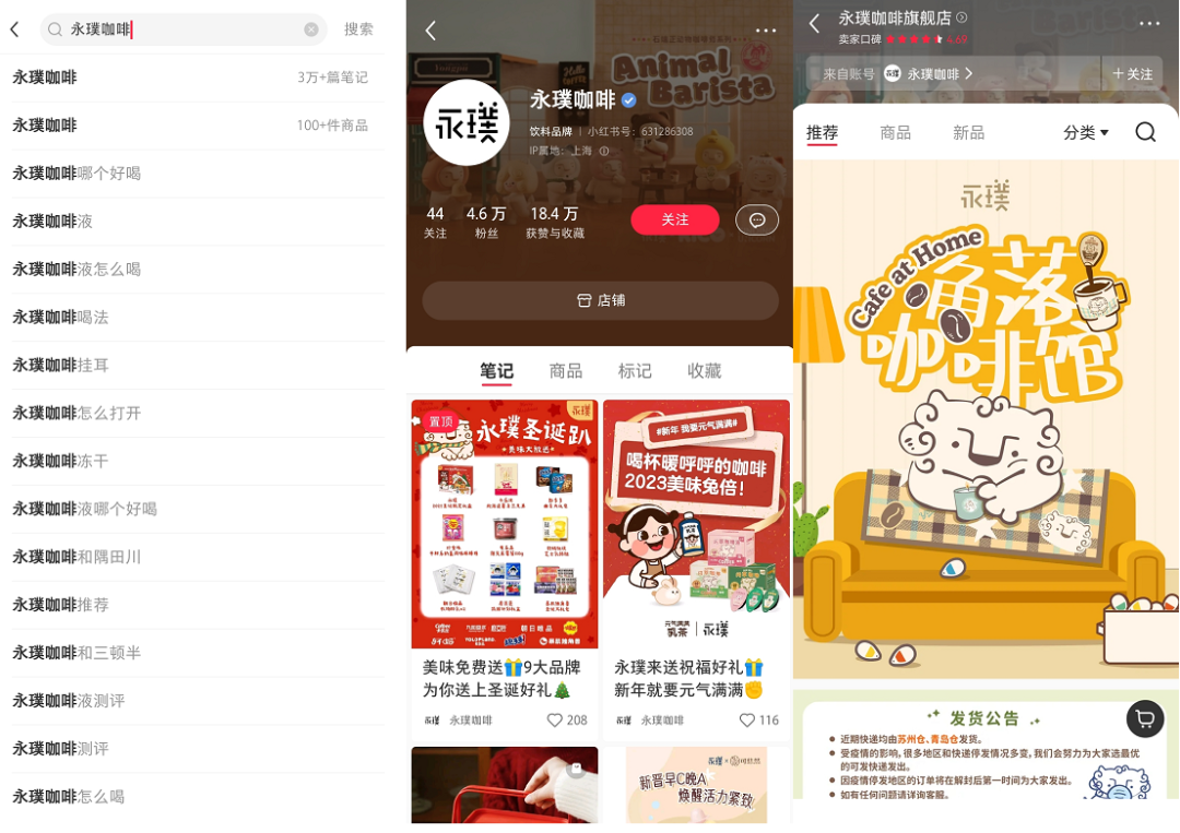 永璞在小红书共有3w+笔记,粉丝超过4.6万,内容以有奖互动、节日营销、联名活动、产品种草为主,另外,永璞开设店铺,锁定用户成交。