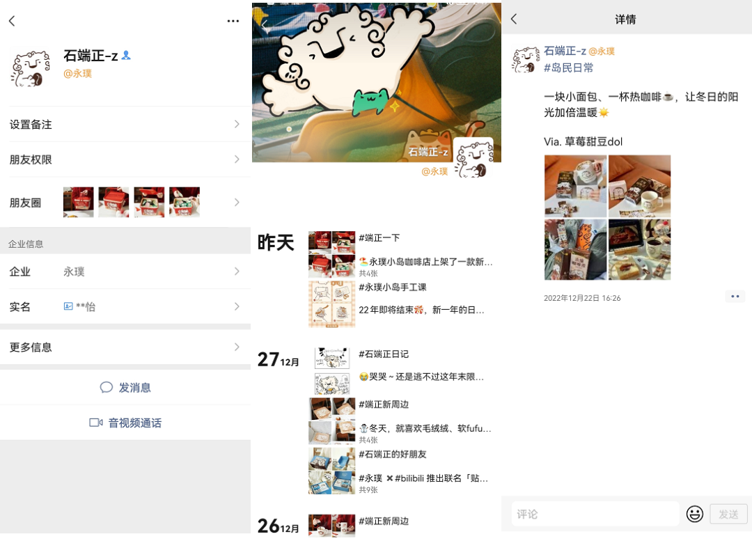 朋友圈内容:主要以“岛民日常、“灵感征集”等生活化栏目为主。例如“岛民日常”主要体现永璞的用户日常生活;“灵感征集”则是永璞的用户产品使用场景分析、使用技巧、感受等。
