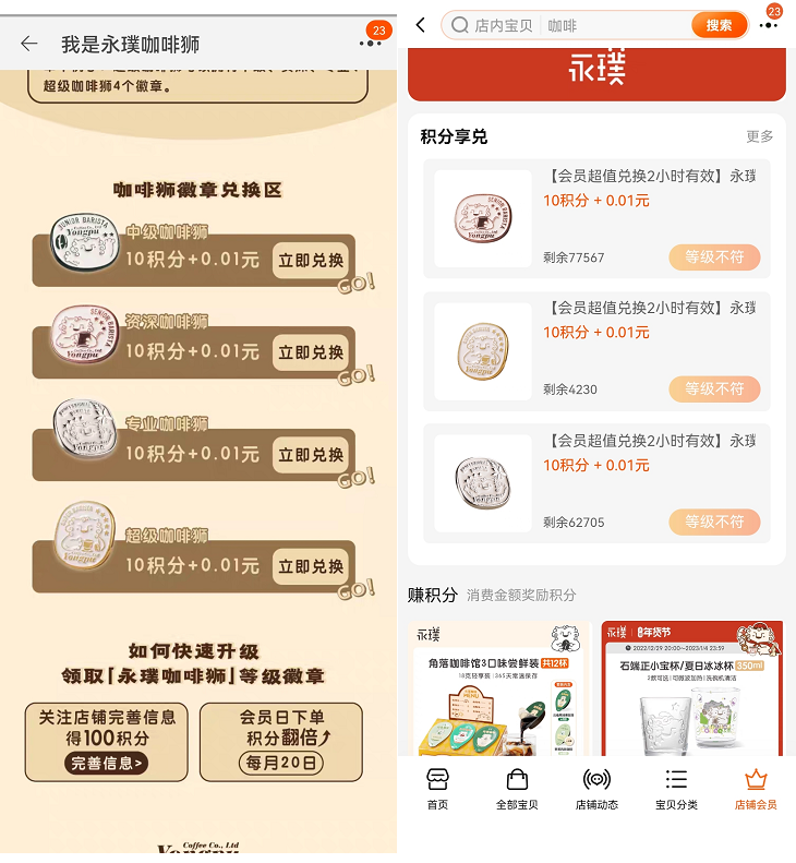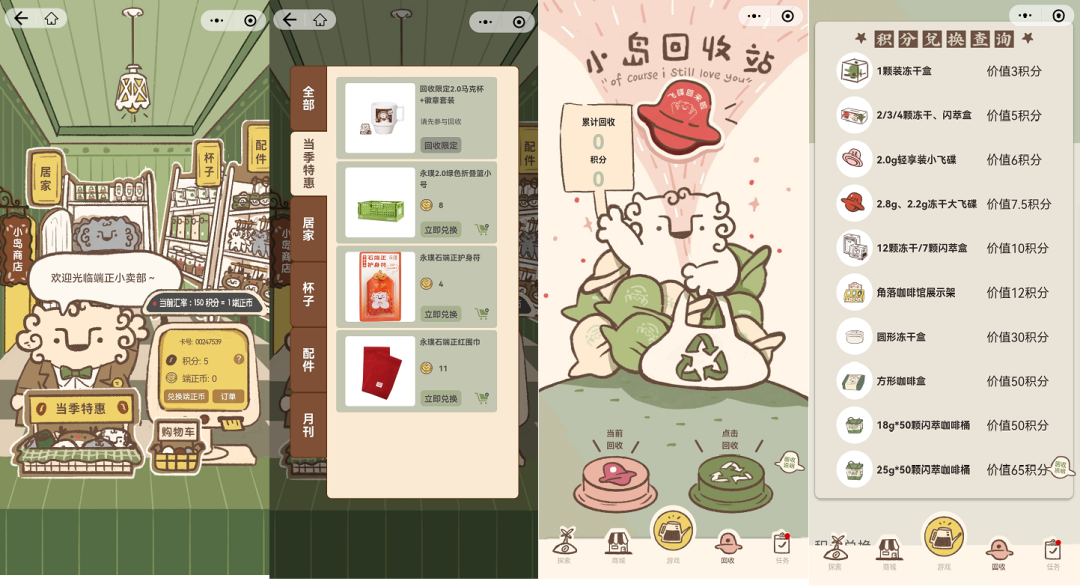 会员积分可以通过签到、回收咖啡外包装、消费等获得,积分可兑换各种周边产品。