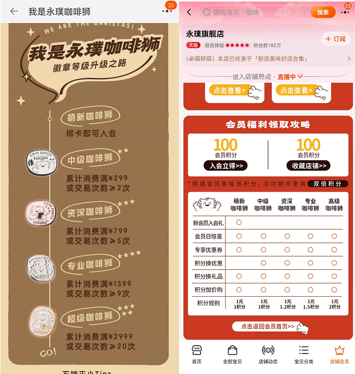 永璞在小程序和电商平台都建立了相应的会员体系,都以成长型会员+积分体系为主。