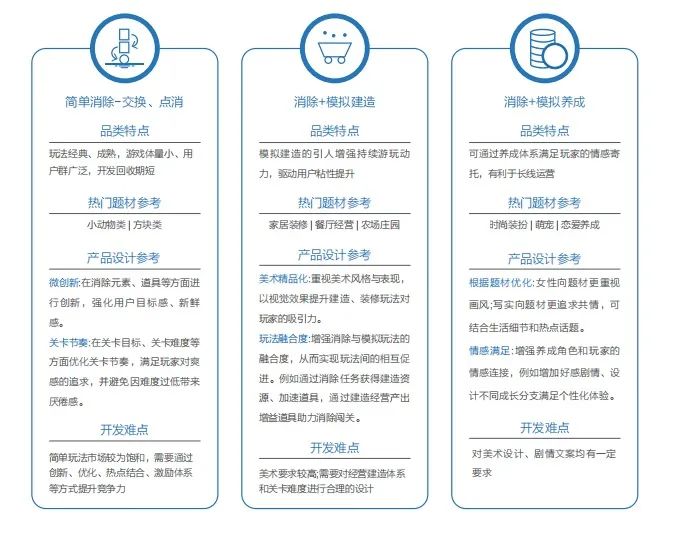 首先是针对成熟阶段的游戏品类(经营养成类、答题解谜类、消除游戏类)分别进行迭代升级。