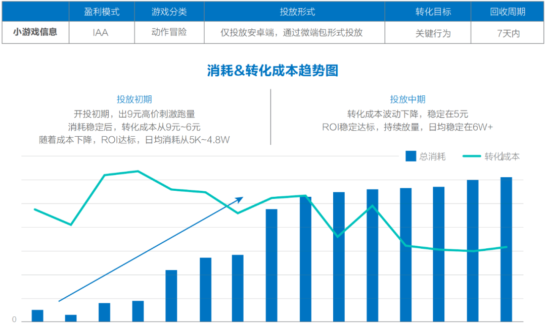 从转化产品上来看,目前,关键行为出价在IAA品类投放中,消耗占比近80%,用户质量&跑量能力双优。建议IAA小游戏,主要投放关键行为出价。并且在投放前期需按日维度关注投后数据,积极进行关键行为埋点调优,从而优化投放效果。