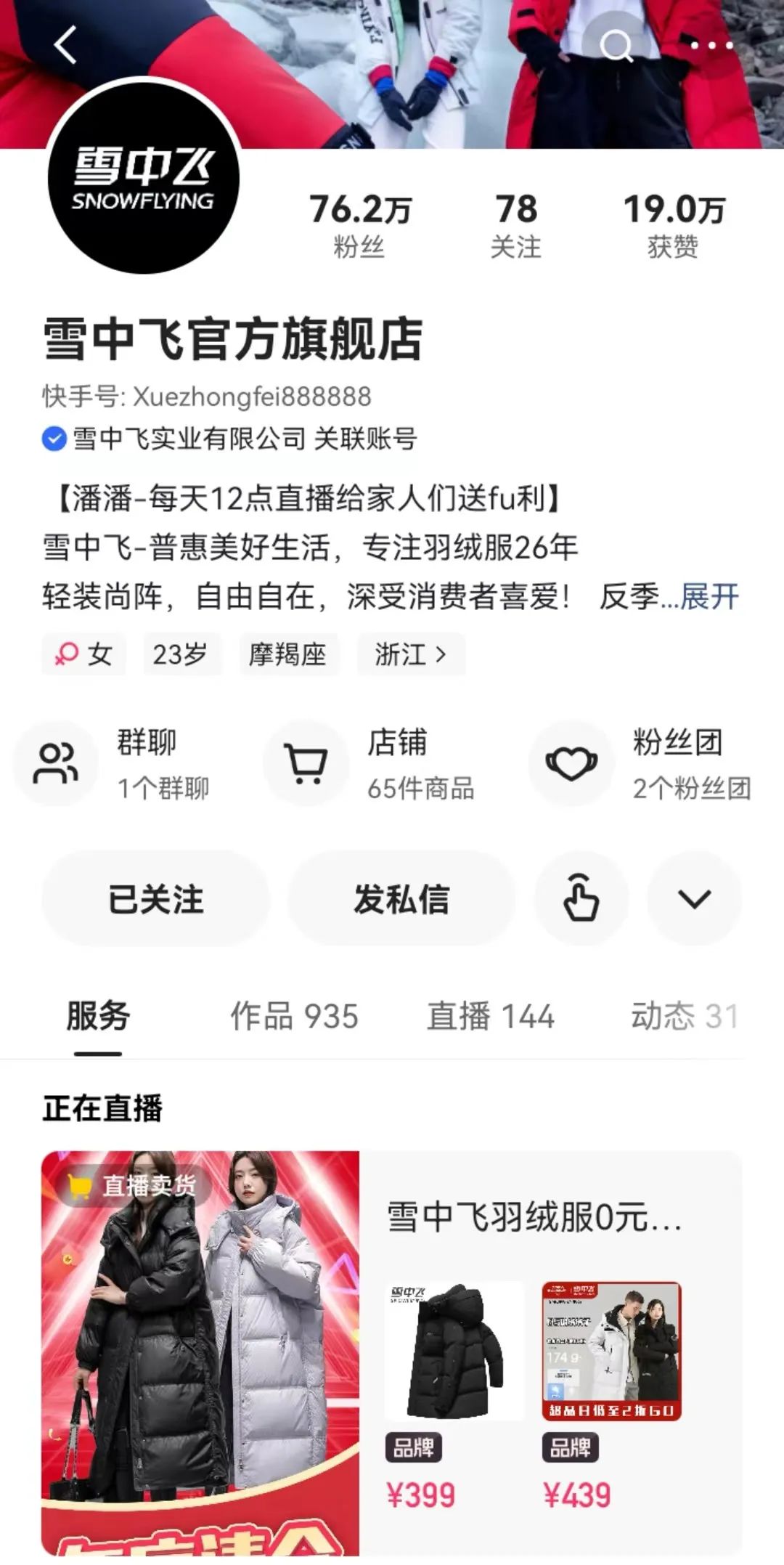 雪中飞入驻快手早期,就按照这个策略积累了第一波流量。有了稳定的流量之后,雪中飞在快手开设品牌官方店铺,打造自播阵地。