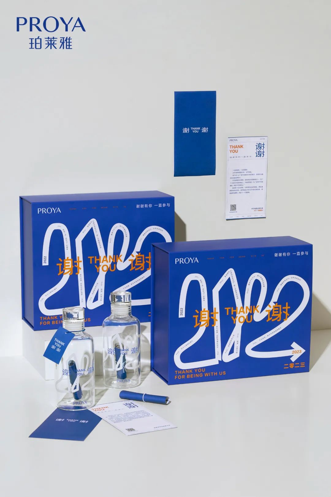 为回馈用户,珀莱雅还打造了2022「谢谢」礼盒。特别设计的「2022」图样,描摹出过去一年珀莱雅和用户们共同走过的每一步。打开礼盒,里面还会有一个「故事瓶」,瓶子里随机收录着一条真实的用户故事。