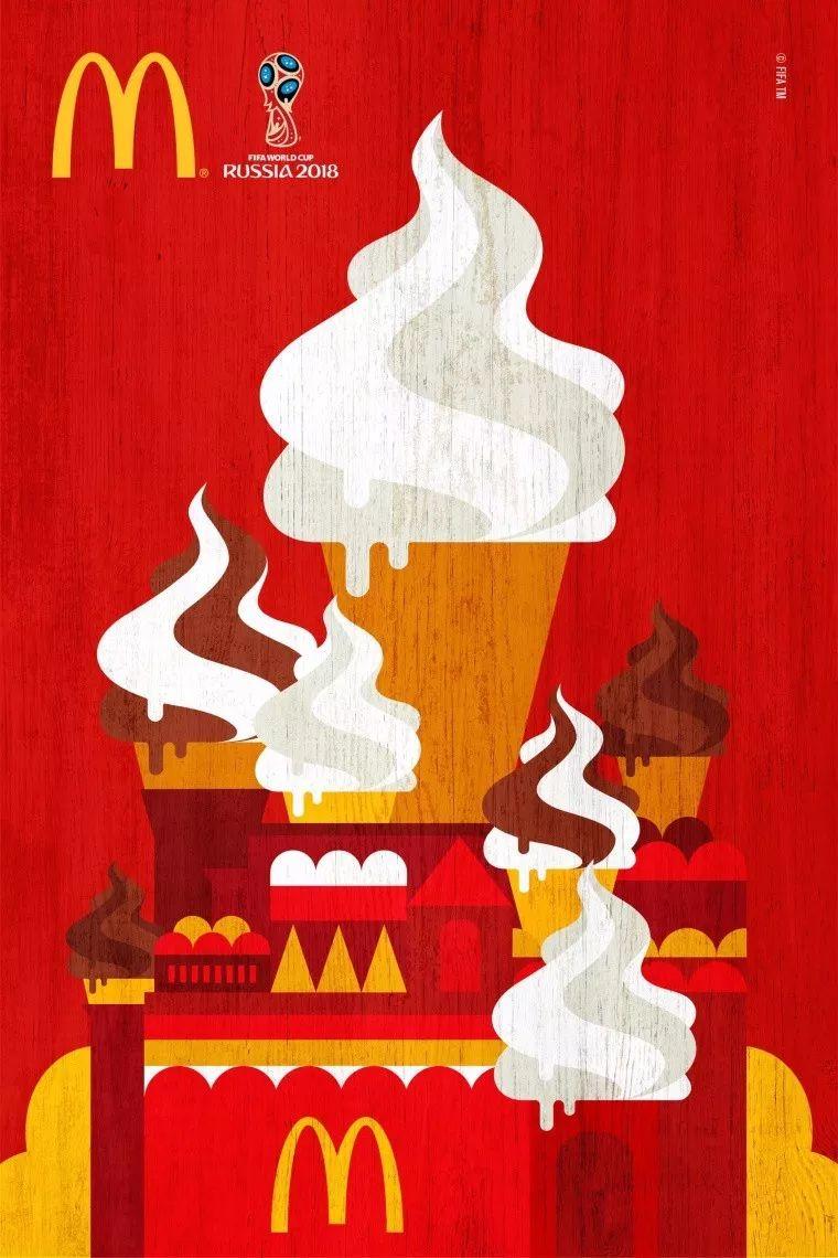 麦当劳作为国际足联世界杯的赞助商在2018年足球杯来临之际,创作了一组以俄罗斯文化为背景的麦当劳平面创意广告海报设计。在海报中,有熟悉的食物元素——冰淇淋和薯条,组成了莫斯科最古老的广场——红场,莫斯科心脏地带——克里姆林宫以及俄罗斯特产木制玩具——套娃及足球这四种意象。