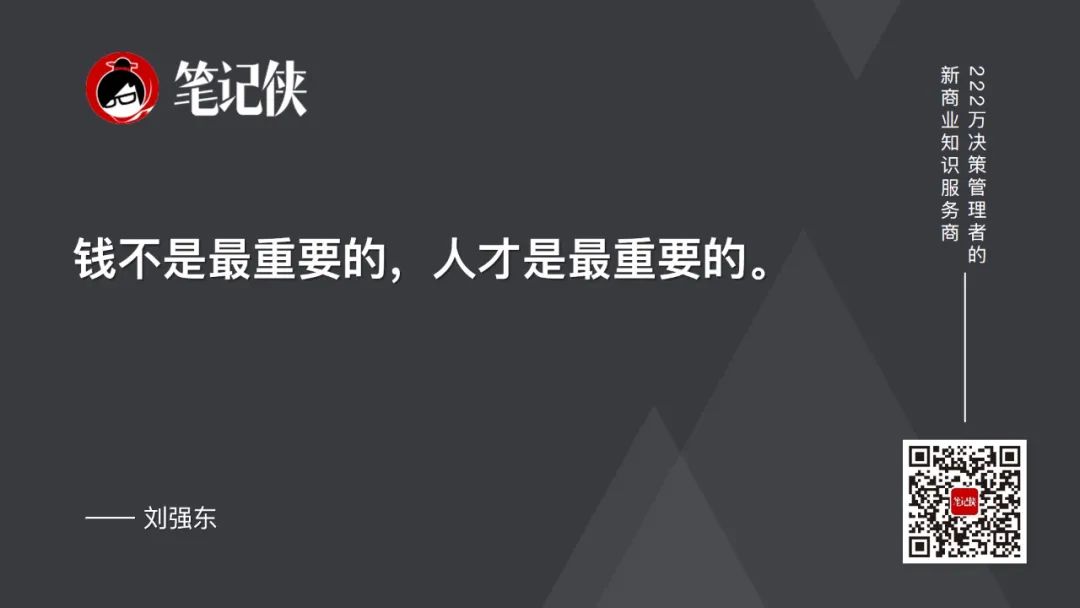 刘强东在哈佛大学讲创业故事的时候曾经说道:“我从来没有看到过哪一个创业者是为了获得更多的财富而创业成功的。”刘强东对企业经营的理解从一开始就很透彻:钱不是最重要的,人才是最重要的。