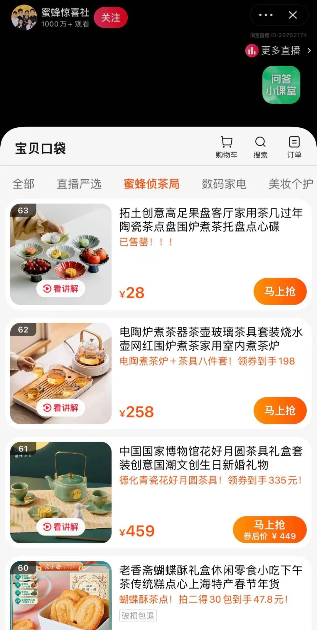 除奈雪这类重点布局线下业务的品牌外,众多主打线上销售的品牌也通过围炉煮茶实现了品牌声量的提升。淘宝“蜜蜂惊喜社”直播间将非遗文化融入直播带货,推出行业里首个茶文化IP直播专场“蜜蜂侦茶局”,联合知名茶文化专家、茶艺师在年货节期间与消费者围炉品茶汤。去年11月至今年1月底,“蜜蜂侦茶局”分别以乌龙茶、红茶、黑茶、白茶以及普洱茶为主题开展了4场直播,上架茶叶及茶周边商品共57款,累计在线观看人数超4000万,其中,第三场“黑茶白茶小专场”销售额突破1000万。