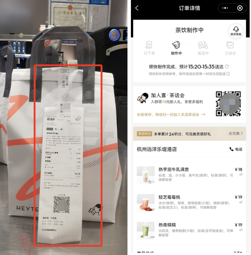 在喜茶线下门店随处可见二维码立牌,另外在用户点单的程序码以及订单小票中都设置了私域触点的引流。
