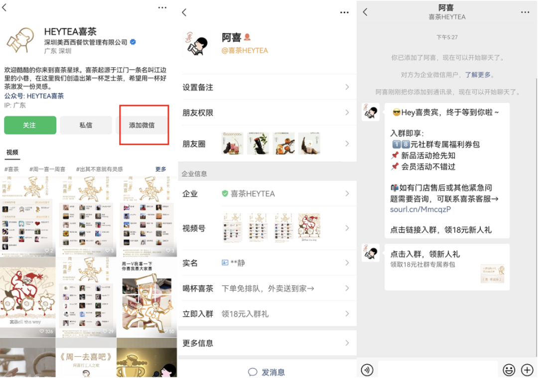 视频号:喜茶在视频号首页设置了企微触点,添加后可直接入群。视频内容以品宣、视频号活动、产品种草、故事剧场为主。