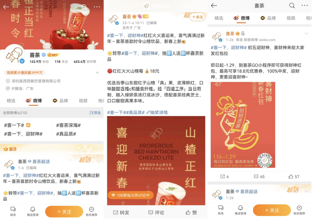 微博:喜茶在微博共有123万粉丝,每天都会发布1-2条内容,内容多数是有奖互动,节日热点、话题互动、产品活动等。并且会以文字+海报的形式引导用户进入小程序。