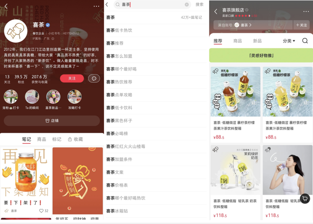 小红书:喜茶在小红书有超过42万的笔记,39.5万粉丝,内容以有奖互动、话题互动、联名活动、产品种草为主。
