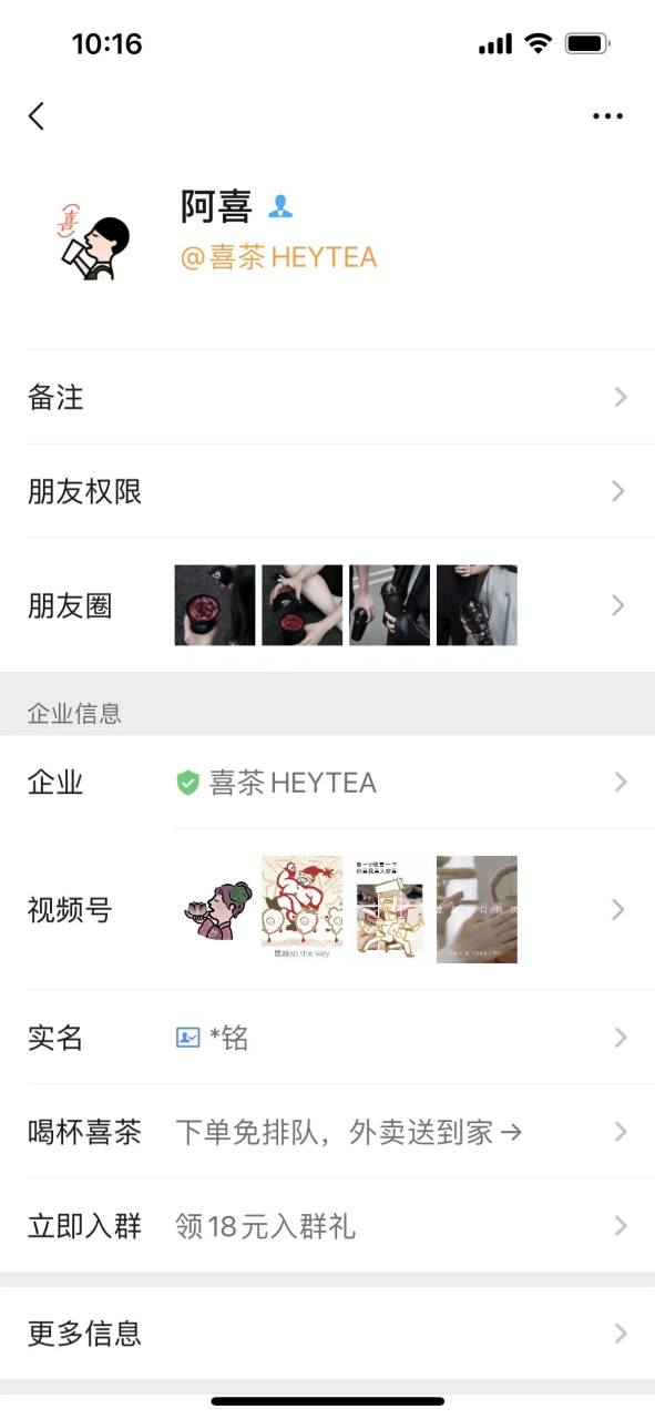 企微名片:在每个阿喜的企微名片里,都能看到绑定视频号、小程序以及入群的链接,合理地利用了资源,多维度进行引流。