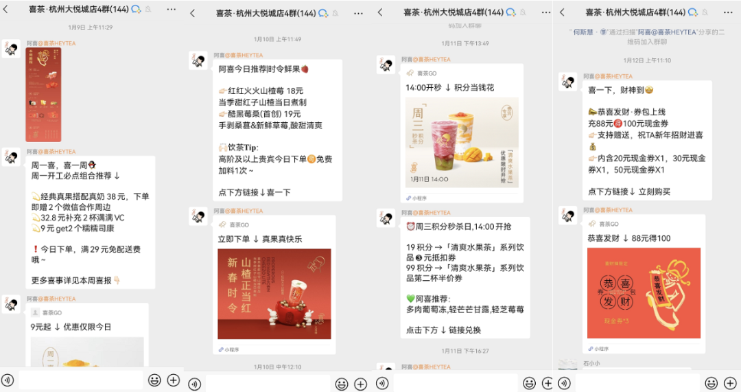 喜茶在全国超过800+门店,社群也以门店群为主,以18元新人入群礼吸引用户进群,并在入群后引导用户进入小程序领券,下单成交。下面以我加入的社群为例: