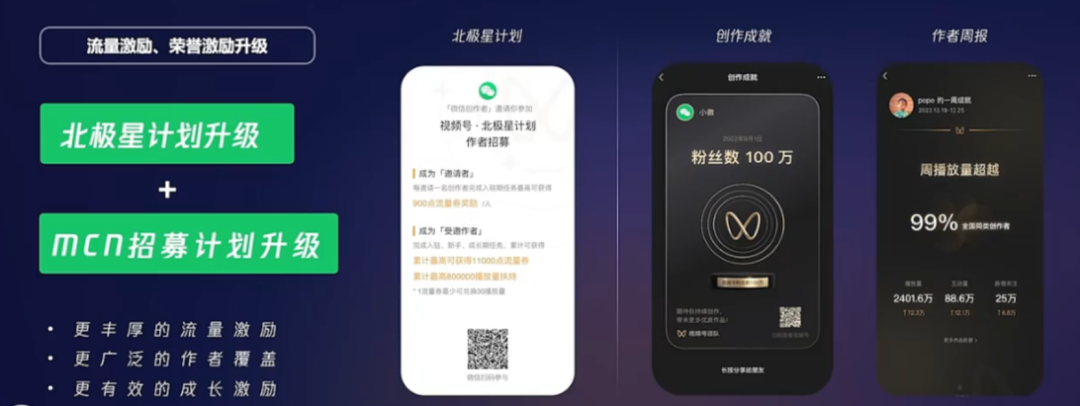 2022年,视频号开始为生态内创作者提供全生命周期服务能力,流量激励、荣誉激励升级,包括北极星计划升级、MCN招募计划升级。